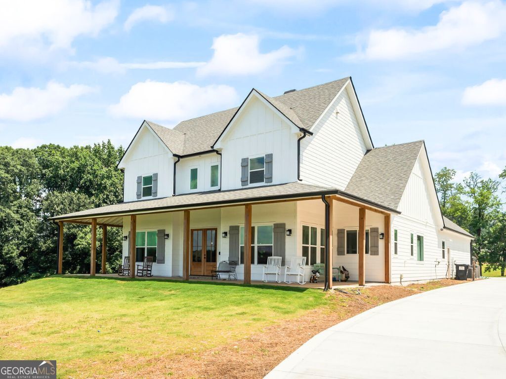 Experience refined living in this custom-built beauty, where timeless design meets modern comfort and a brand new driveway welcomes you home with style and convenience. From the moment you arrive, the panoramic views from the charming front porch set the tone for what awaits inside. Step into a breathtaking open-concept layout where soaring ceilings and uninterrupted sightlines create a sense of spaciousness and flow, from the foyer straight through to the back door. Whether you're entertaining friends or enjoying a cozy evening by the fireplace, the seamless connection between the living room, dining area, and chef-inspired kitchen offers a perfect mix of elegance and warmth. The kitchen is a true showstopper, anchored by a massive island and equipped with a generous walk-in pantry. It provides both form and function for everyday living and gourmet cooking alike. Thoughtful finishes and ample storage make it a dream space for home chefs and hosts. On the main level, the primary suite is a private retreat featuring a luxurious spa-like bath with a frameless glass shower, deep soaking tub, and expansive double vanity. The custom walk-in closet is as functional as it is fabulous, designed to keep everything organized in style. Upstairs, you'll find three spacious secondary bedrooms, a dedicated home office, and plentiful unfinished storage space. It's ideal for future expansion or easy access to seasonal decor. Out back, the covered rear patio invites you to relax and unwind in a peaceful, private setting. With the brand new driveway, you'll enjoy a flawless first impression and added convenience every single day. This home is more than just a place to live. It's a carefully crafted haven where design meets livability. Schedule your private tour today and discover the perfect blend of luxury, practicality, and undeniable charm.