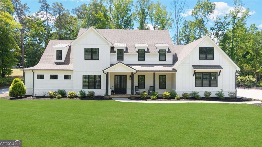 Breathtaking Farmhouse on 2.3 Acres, located on a Quiet Cul-de-Sac, in The Collection at Trinity enclave. This stately property features the main home with 3 car attached garage PLUS a 40' x 60' Garage with THREE bays that can be finished to your specifications! This custom built home by Hunt Homes is warm and inviting with a front porch perfect for rocking chairs, overlooking a lush green front yard. Step inside the front entrance to newly refinished oak hardwood floors and handsome wood paneling. To the left is a cozy home office with custom shelving and a built-in desk, and can be used as a formal living or dining area. A spacious open concept kitchen, dining and living room is tastefully designed and ideal for entertaining. The impressive chef's kitchen features Founders custom cabinetry, Taj Mahal quartzite, a stunning Le Cornue range, Subzero refrigerator. and hidden Appliance cabinet. Along with ample storage space in the kitchen, the home offers a walk-in pantry with custom shelving, plus a butlers pantry and an additional storage closet. The spacious living area opens out to a gorgeous screened in porch and walk-out saltwater pool and spa. The generously sized Primary Bedroom is perfectly tucked away on the Main Level with a bathroom featuring an oversized shower and soaking tub and a roomy walk-in closet with tons of shelving. The main level provides an additional Guest Bedroom and beautifully finished bathroom, great for accommodating multi-generational family members, plus a powder room for visitors and a separate half bath that services the pool! Upstairs offers 4 secondary bedrooms and 2 full baths - one bedroom is fitted with glass doors and makes for an excellent workout room or quiet space for kids to do homework. The upper level also offers an incredible 1,100 square foot BONUS room: perfect for a media room and play room! This home is an entertainers dream with a flat, fully turfed and fenced backyard beyond the heated saltwater pool. The second detached building measuring 40' x 60' with 3 bays, one with a 14' tall door for RVs, stubbed for bathroom. This home is beautifully situated on a quiet cul-de-sac street, surrounded by undisturbed pastures. It's the perfect setting, with highly rated schools, and located just minutes from Milton, Crabapple, and so much more!