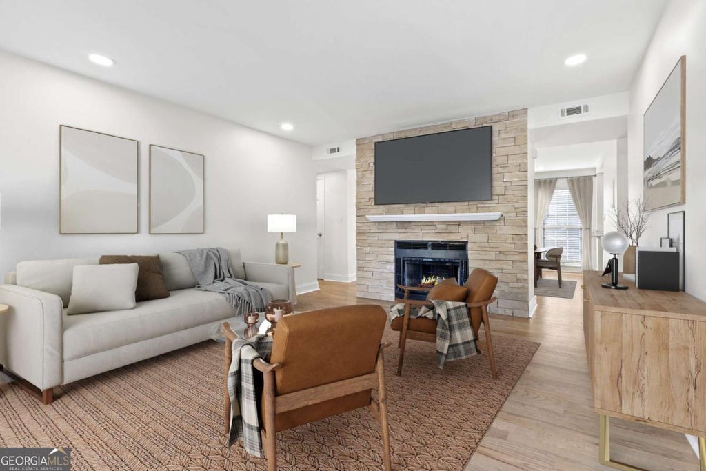 Just minutes from Marietta Square, this beautifully renovated 2-bedroom, 2-bath condo offers comfort, style, and convenience in a gated community with a pool and dedicated parking. Featuring brand-new luxury vinyl plank flooring, fresh paint, granite countertops, white shaker-style cabinets, and all-new appliances, the home combines modern upgrades with thoughtful design. The split roommate floor plan ensures privacy, with each spacious bedroom offering its own bathroom and walk-in closet, while the cozy living room with fireplace flows into a dedicated dining area and bright sunroom filled with natural light. Situated on the second floor with no neighbors above, this move-in ready condo provides peace and quiet while still being close to shopping, dining, and parks. Don't miss your chance to own this updated home in a prime Marietta location-schedule your showing today!